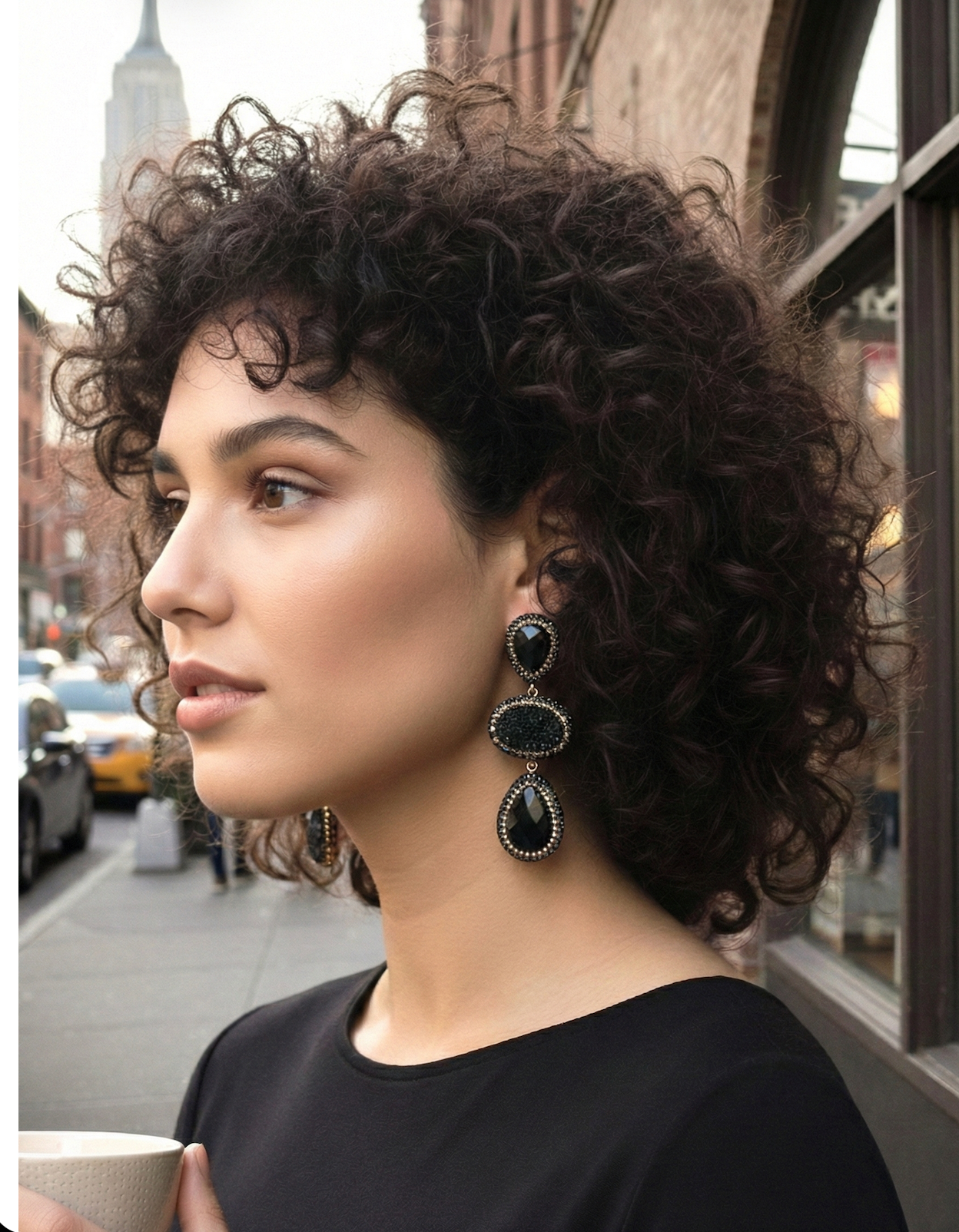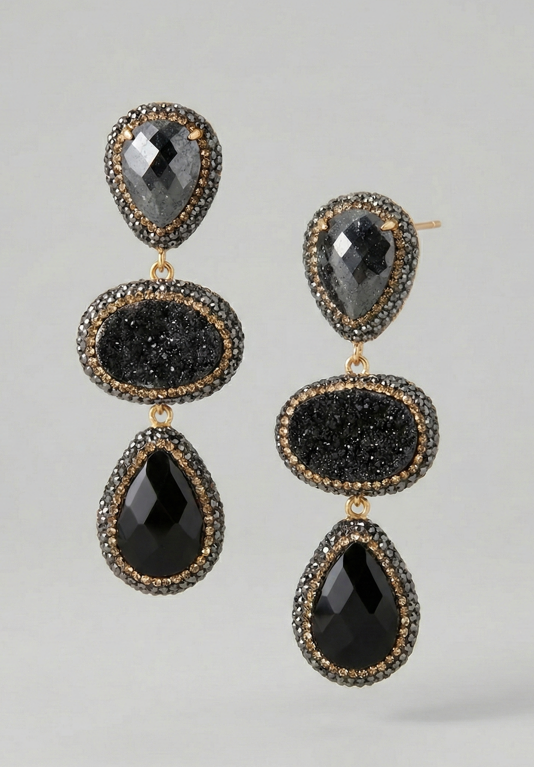 De elegante druppelvormige hangers bewegen subtiel mee bij elke stap en geven een verfijnde, opvallende uitstraling. Draag je haar achterover om de glans van de zwarte onyx en de ruwe chalcedoon optimaal te laten spreken.